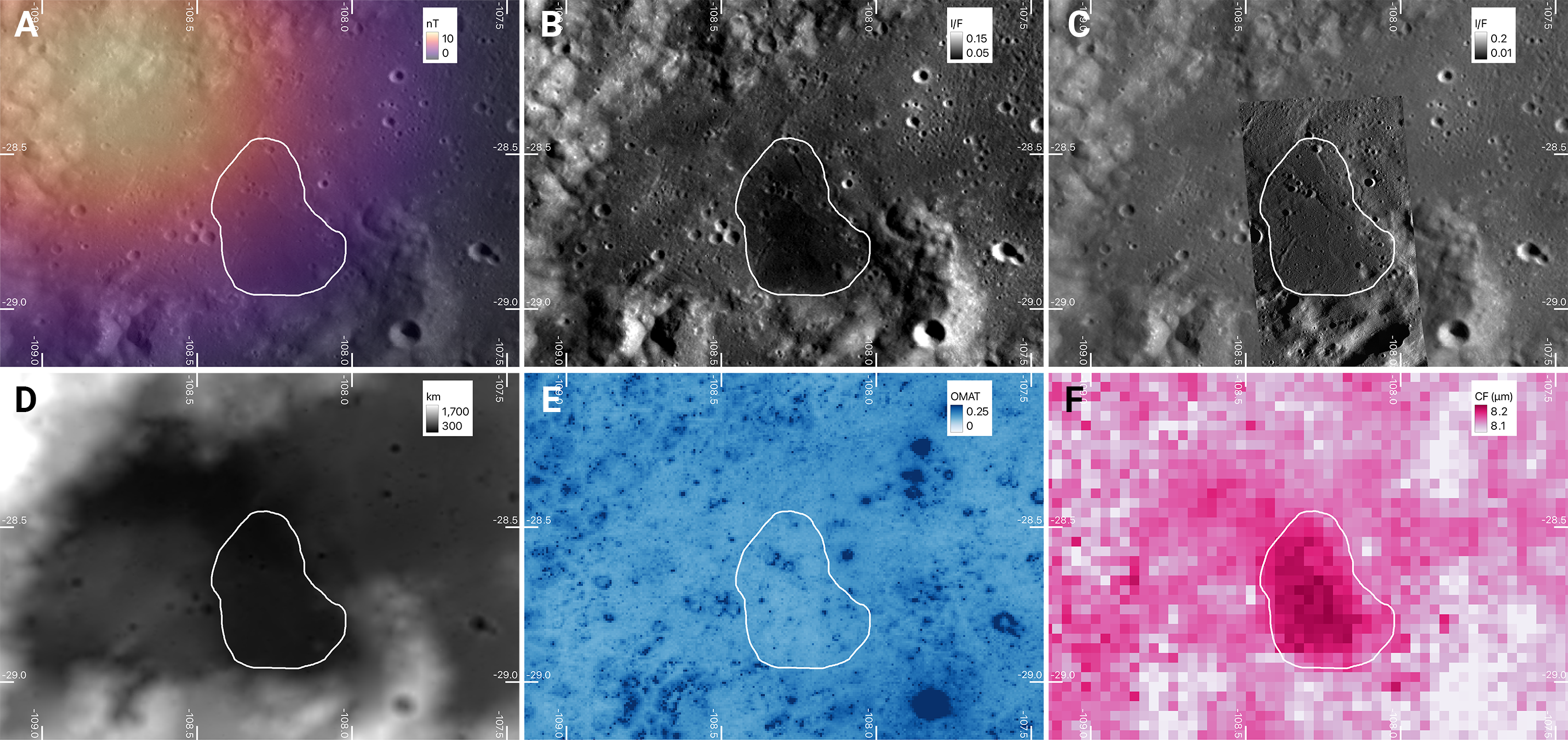 (A) The small mare (white boundary) at the edge of a localized magnetic anomaly. (B) LROC WAC I/F, stretched to reveal the mare extent (white boundary). (C) LROC NAC ROI over the extent (white boundary). (D) LOLA DEM elevation over the extent (white boundary). (E) Kaguya MI OMAT over the extent (white boundary). (F) Diviner Christiansen Feature over the extent (white boundary).