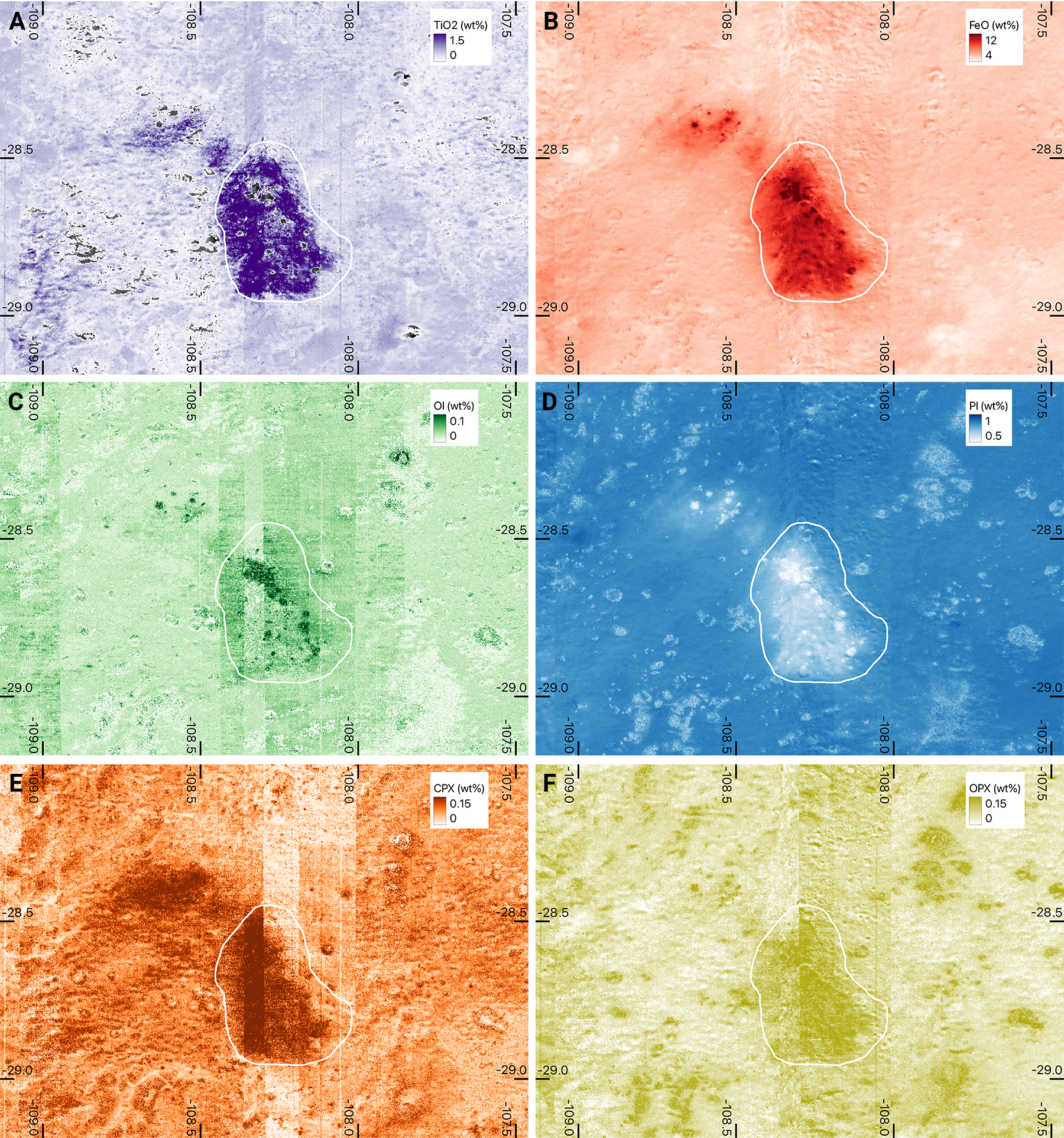 The mare noted above is outlined with a white boundary. (A) TiO2 abundance (wt%). (B) FeO abundance (wt%). (C) Olivine abundance (wt%). (D) Plagioclase abundance (wt%). (E) Clinopyroxene abundance (wt%). (F) Orthopyroxene abundance (wt%).