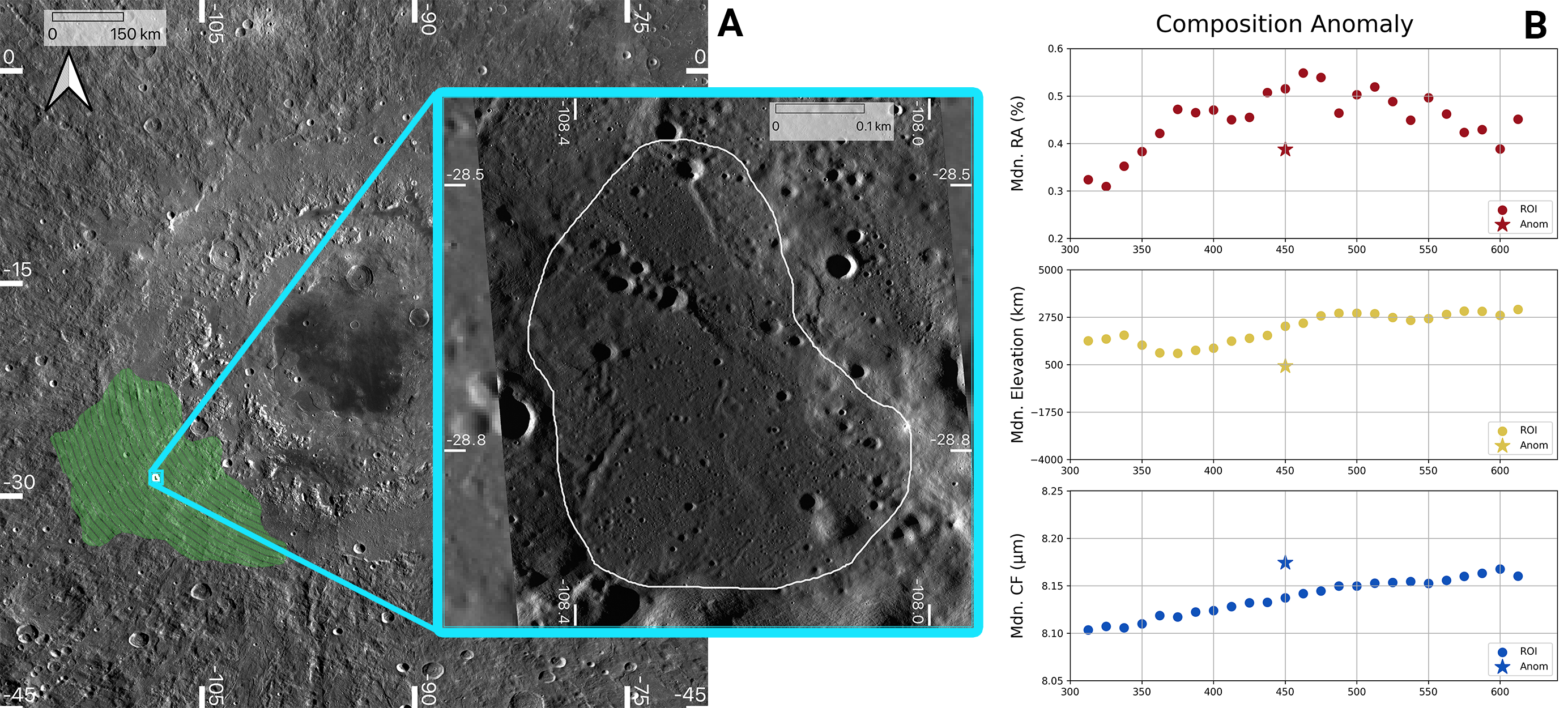 I have also worked with the Lunar Reconnaissance Orbiter Mini-RF team, investigating fundamental electromagnetic interactions in radar data and subsurface structures that may cause unique roughness expressions. We studied regional statistics in multiple datasets across Orientale Basin to understand its uniquely immature signatures in radar data, and discovered a previously-unmapped mare in an anomalously rocky region to the southwest of the basin (see Waller et al. 2025b).